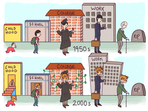 The decision is obviously easier if you are younger, with much less to lose. But many who are young still choose the apparent safety of the credentialist scripts of their parents. These are what David Brooks called Organization Kids (after William Whyte's 1956Â classic, The Organization Man7): those who bet (or allow their "Tiger" parents8 to bet on their behalf) on the industrial social order. If you are an adult over 30, especially one encumbered with significant family obligations or debt, the decision is harder.