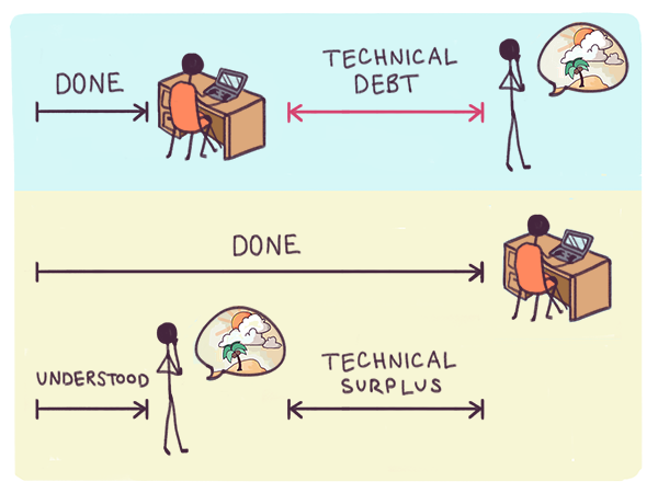 [3] Technical debt, a notion introduced by Ward Cunningham (the inventor of the Wiki) in 1992, is conceptually similar to debt in the economic sense. It usually refers to known pending work, such as replacing temporary expedient hacks with ideal solutions, and "refactoring" to improve inefficiently structured code. The "debt" is the gap between the idealized version of the feature and the one actually in place. In somewhat looser usage, it can also refer, in waterfall processes, to unfinished features in the authoritarian vision that may only exist as stubs in the code or unimplemented specifications. In the context of agile processes, however, all such debt, created through either expedience or incompleteness, is not necessarily "must do" work. If an experimental feature is not actually adopted by users, or rendered unnecessary by a pivot, there may be no point in replacing an expedient solution with an idealized one. Technical surplus can analogously be thought of as the unanticipated growth opportunities (or optionality in the sense of Nassim Taleb in Antifragile) created by users doing creative and unexpected things with existing features. Such opportunities require an expansion in the vision. The surplus comprises the spillover value of unanticipated uses. As in economics, a project with high technical debt is in a fragile state and vulnerable to zemblanity. A project with high technical surplus is in an antifragile state and open to serendipity.