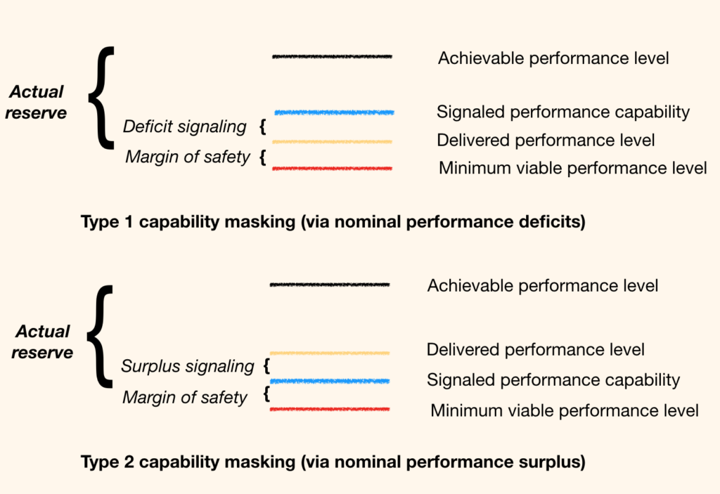Capability masking is the opposite of "fake it till you make it" behavior, and comes in two varieties, illustrated below, both of which are involved in the behavior commonly referred to as sandbagging.